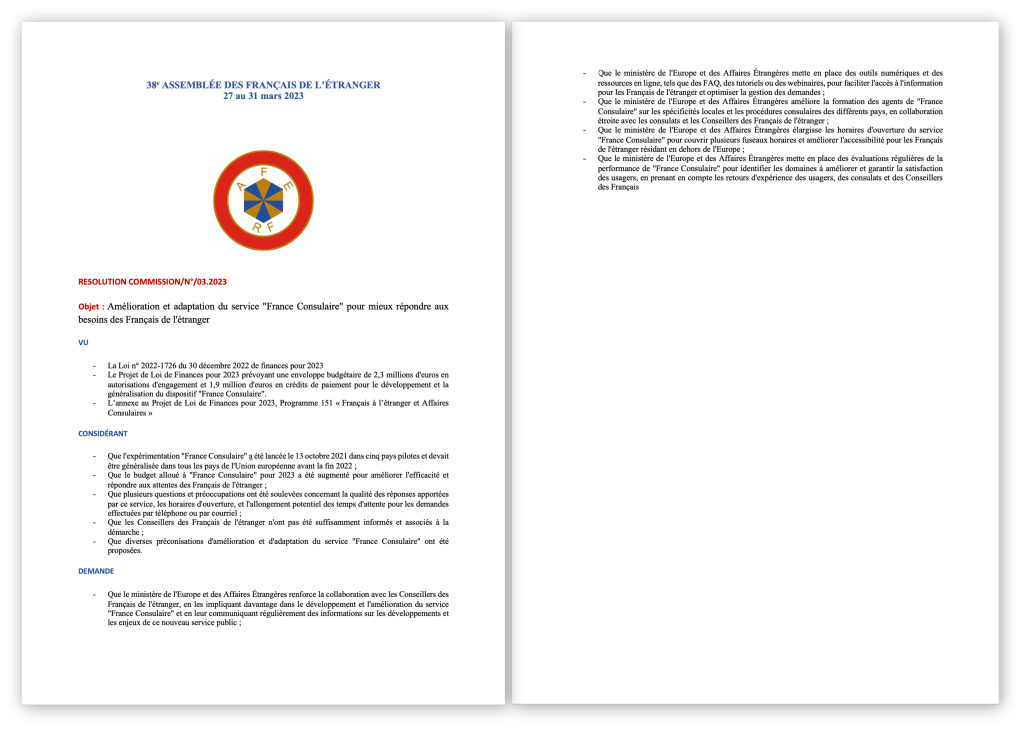 [Résolution de l’Assemblée des Français d l’Étranger] Amélioration du service France Consulaire