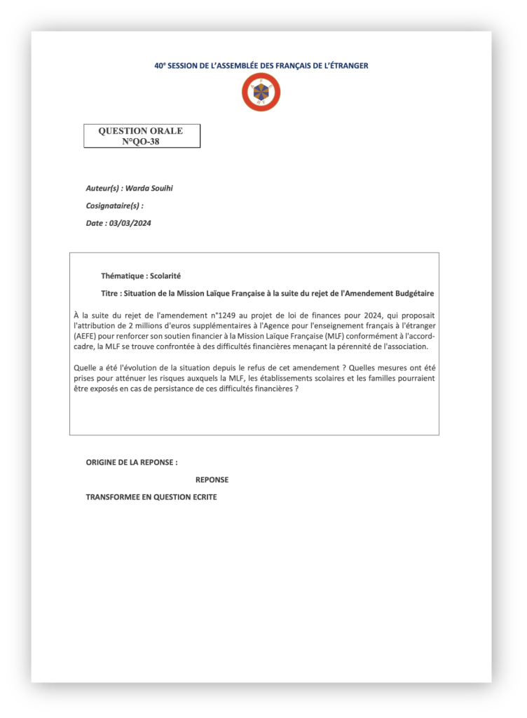 [Éducation française][Réponse de l’administration à ma question] Situation de la Mission Laïque Française à la suite du rejet de l’Amendement Budgétaire