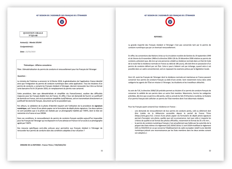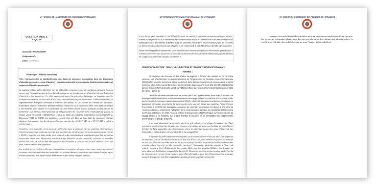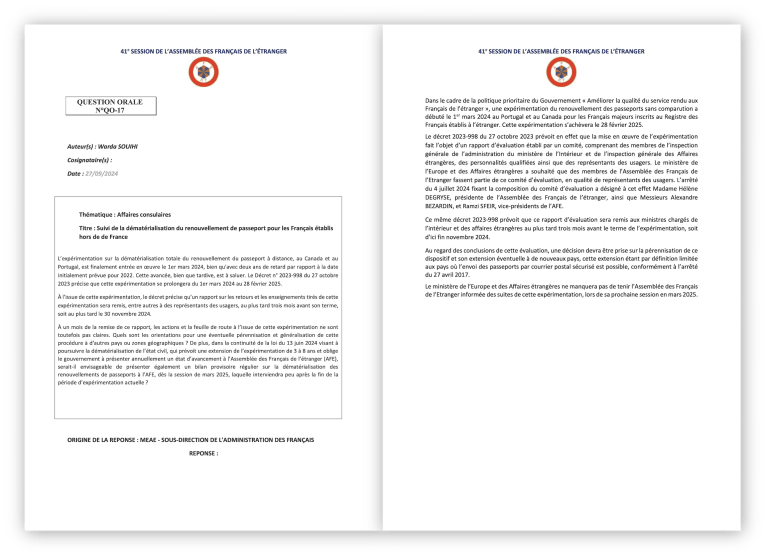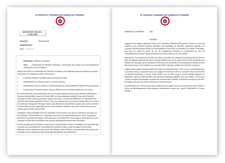 Lire la suite17 octobre 2025: À la 43ᵉ session de l’Assemblée des Français de l’Étranger, j’ai eu l’honneur d’être co-rapporteur au sein de la Commission des lois, règlements et affaires consulaires sur un sujet essentiel : l’accompagnement des Françaises et Français de l’étranger victimes de violences, notamment intrafamiliales 🇫🇷🤝. Ce que je retiens surtout de ce travail, c’est une réalité : quand on vit loin de la France, chercher de l’aide peut devenir un parcours compliqué, alors même que l’urgence impose des réponses rapides, lisibles et coordonnées 🌍⏱️. Les échanges que nous avons conduits ont mis en lumière des besoins urgents : 🔸 Renforcer la protection des femmes et des enfants 👩👧👦🛡️. 🔸 Améliorer l’accès au droit pour les Françaises et les Français de l’étranger ⚖️📌. 🔸 Mieux coordonner l’action entre les postes consulaires, les associations locales et les dispositifs français d’assistance juridique et sociale 🤝🏛️🧩. En parallèle, j’ai continué à porter des sujets prioritaires pour notre circonscription : 🔹 La dématérialisation du renouvellement des passeports 🛂📲. 🔹 La certification de l’identité numérique et le renouvellement anticipé des cartes d’identité 🆔✅. Mon rôle, c’est d’obtenir des avancées concrètes 🎯📣. Je continuerai à suivre ces dossiers de près et à demander des réponses tant que des solutions claires ne seront pas effectivement mises en place pour notre circonscription 🔎📌. Si vous avez rencontré une difficulté ou si vous souhaitez me signaler une situation : écrivez-moi ✉️. Vos retours sont précieux pour appuyer ce travail et obtenir des réponses solides 🙏💬.