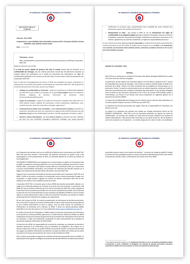Lire la suite[Lutte contre les violences conjugales et intrafamiliales][Réponse de l’administration à ma question] Confidentialité et sécurité des données de victimes transmises à la DFAE par l’association SAVE YOU